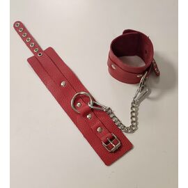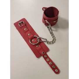 Наручники выполнены из красной натуральной кожи. Изделие декорировано металлическими заклёпками. Наручники надежно фиксируются пряжками и ремнями, позволяющими выбрать нужный размер, подойдут на обхват руки от 13 до 23 см. Кожаное соединение на карабинах фиксирует наручники вместе, общая длина...