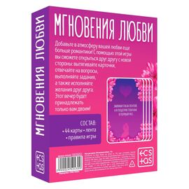 Романтическая игра для двоих Вытягивайте карточки, отвечайте на вопросы, выполняйте задания и воплощайте в жизнь желания друг друга. В наборе: 14 листов «Желания»; 15 листов «Задания»; 15 листов «Воспоминания»; лента для глаз; правила игры.