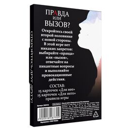 Узнайте секреты друг друга! Представляем новинку «Правда или действие? Без комплексов», которая поможет вам открыться своей половинке с новой стороны. Забудьте все запреты, просто отвечайте на пикантные вопросы и выполняйте провокационные задания. Что нужно делать? Откройтесь своей второй...
