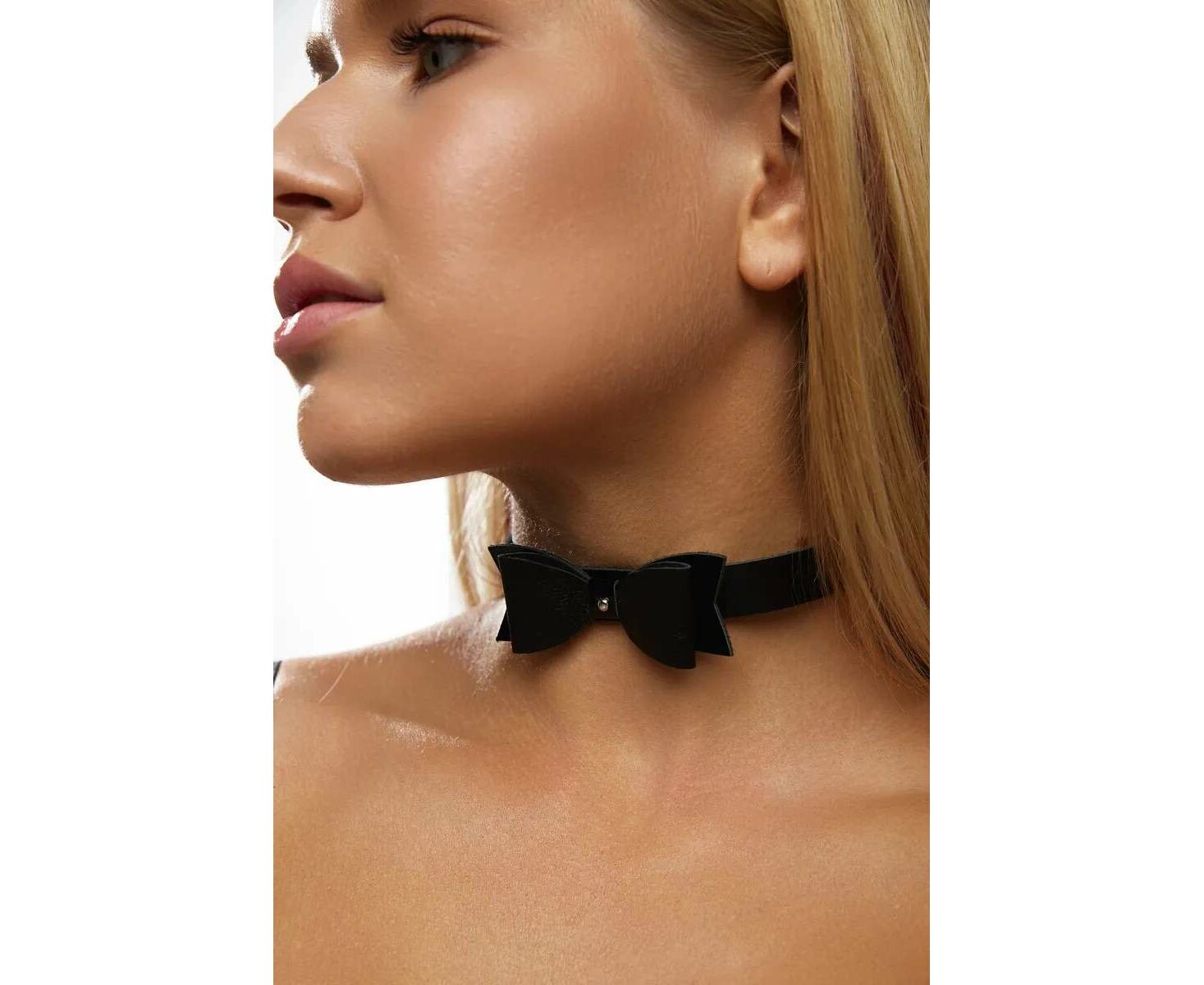 Однослойный чокер из натуральной кожи. Декорирован трехслойным кожаным элементом в виде галстука-бабочки, прочно закрепленным на чокере.