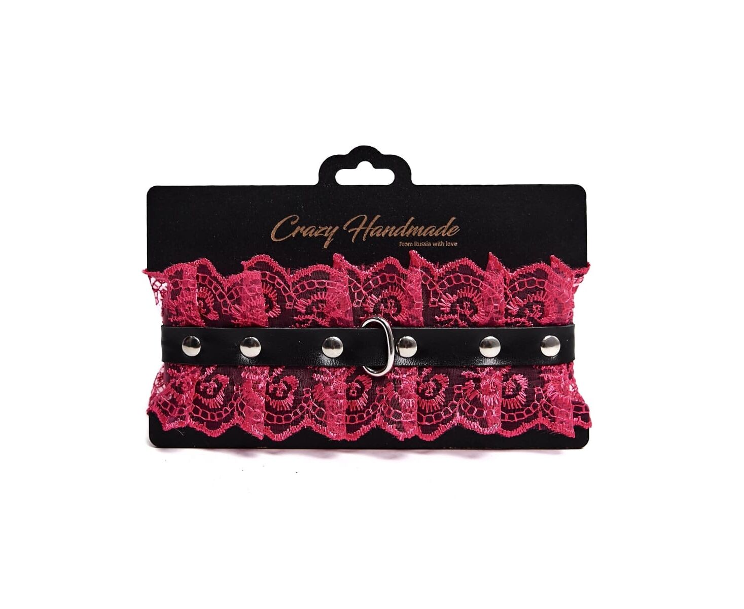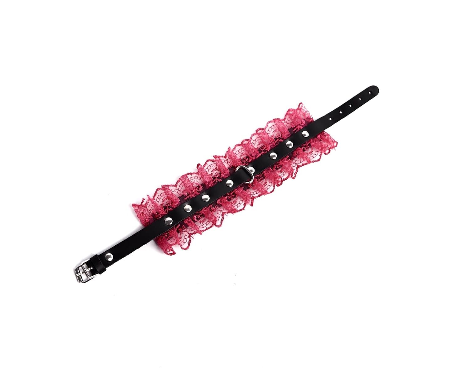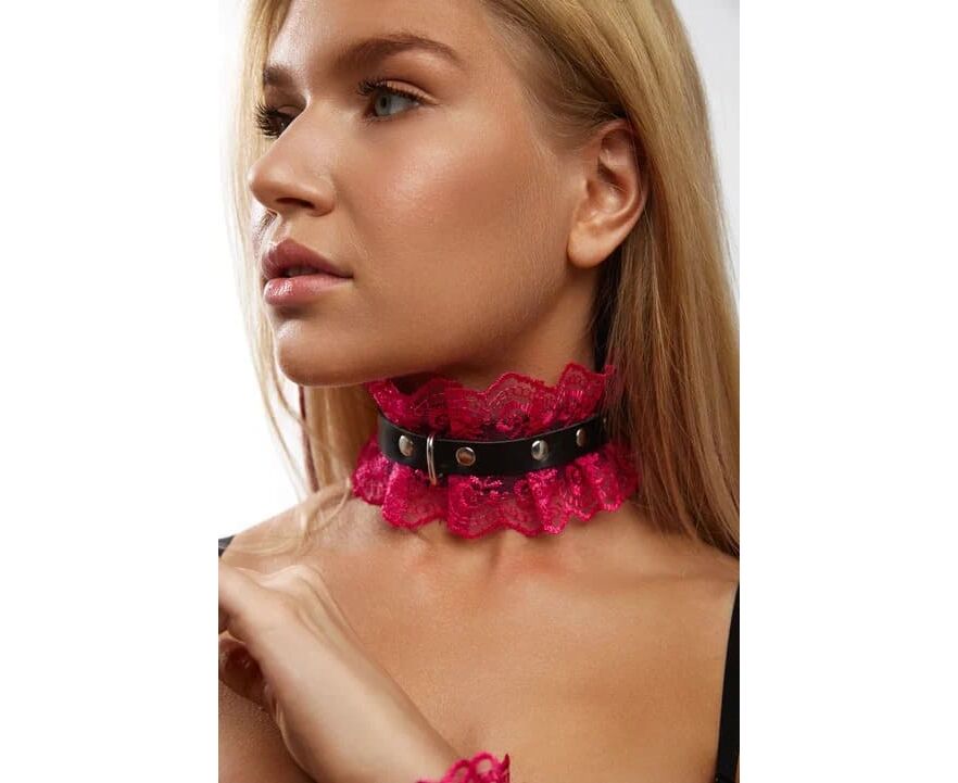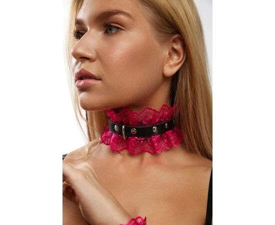 Элегантный чокер из натуральной кожи черного цвета, декорирован кружевом в цвете фуксия. Для регулировки длины кляпа на ремешке имеется 5 отверстий. Нежная натуральная кожа очень комфортна в использовании.