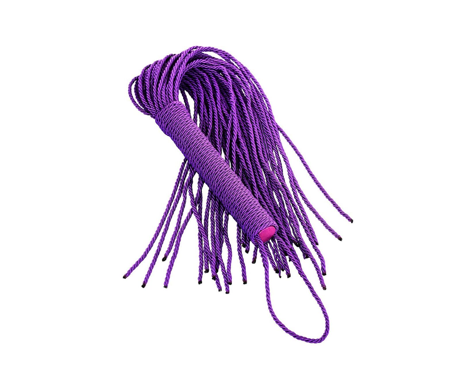 Сиреневый веревочный флоггер с плетеной ручкой мягко разогревает кожу и готовит к более серьезным воздействиям.