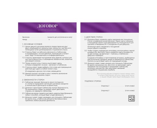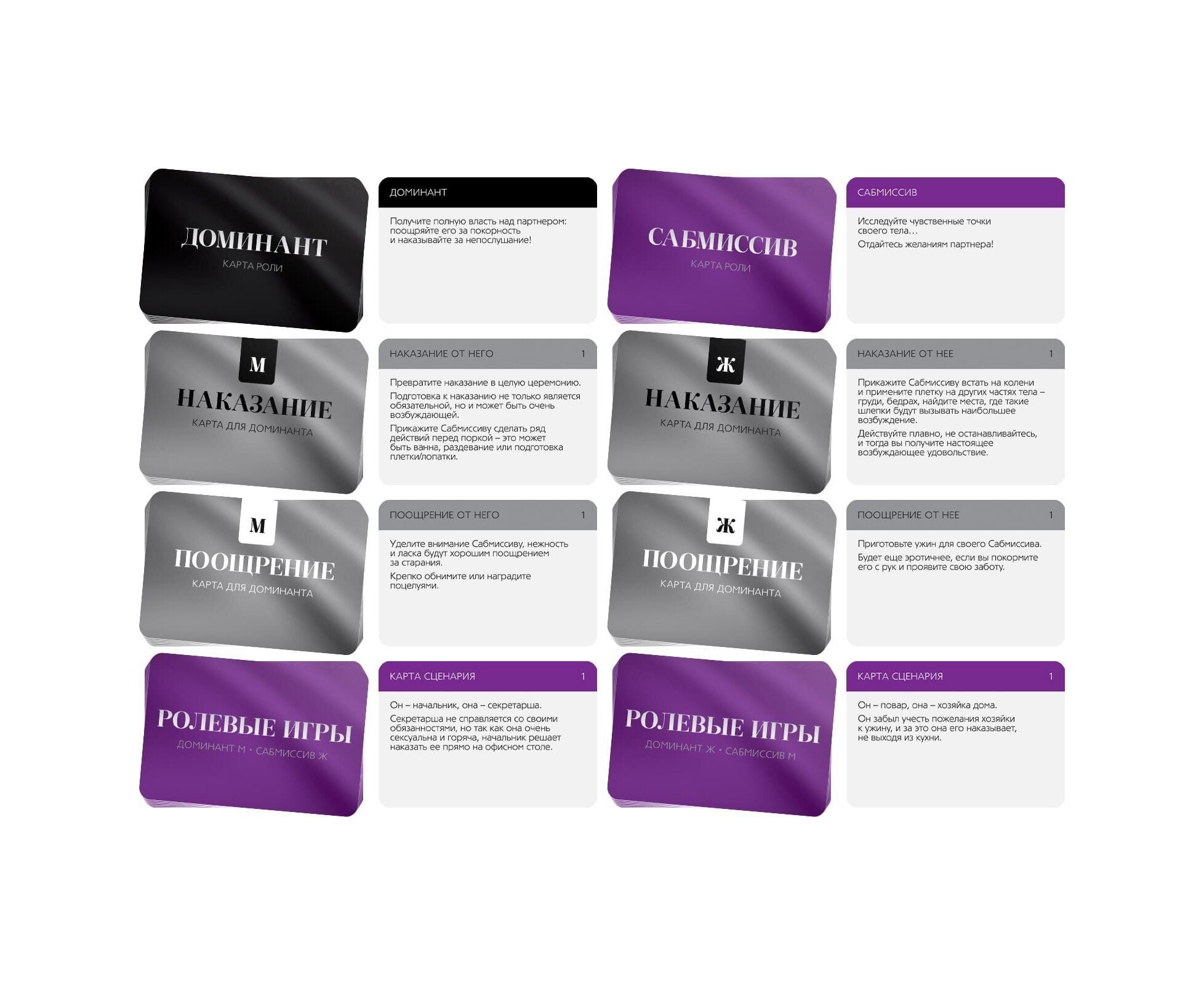 Хотите испытать новые эмоции? С этой игрой наказания будут ещё более возбуждающими, а карты ролей помогут создать приятную атмосферу. Вам нужно лишь расслабиться и полностью погрузиться в процесс. Подпишите договор о неразглашении и выберите желаемую роль. Один из вас будет доминирующим (доминантом), а другой — подчиняющимся (сабмиссивом). Доминирующий в любом порядке вытягивает карты из колод наказания и поощрения. Если вы хотите сделать игру более волнующей, вытяните карту из колоды ролей — и этот вечер подарит незабываемые эмоции. В комплекте есть интригующие аксессуары, которые нужно использовать во время игры.