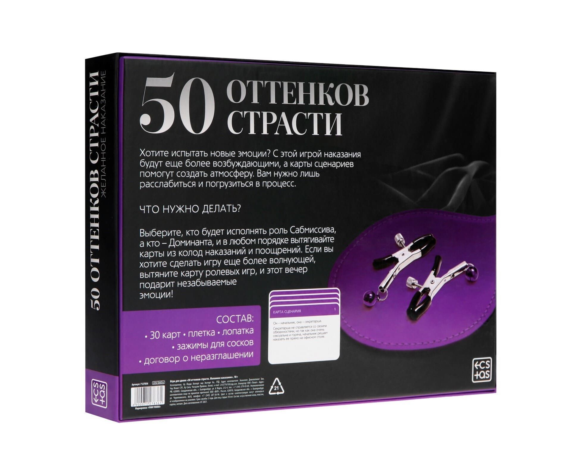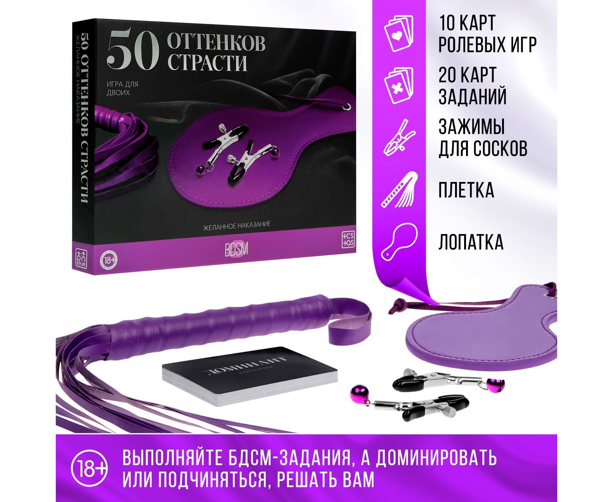 Игра для пар «50 оттенков страсти. Желанное наказание», 4 в 1 (30 карт, плётка, лопатка, зажимы для сосков), 18+