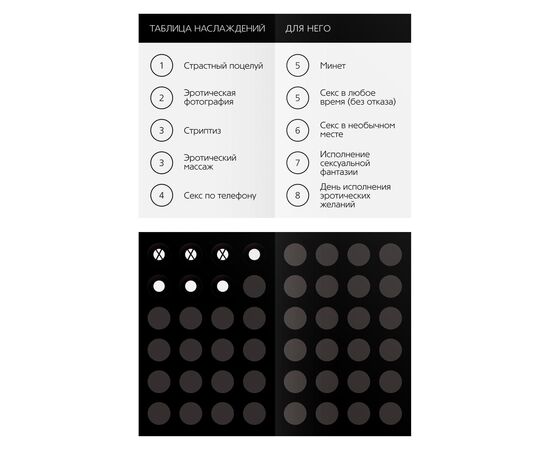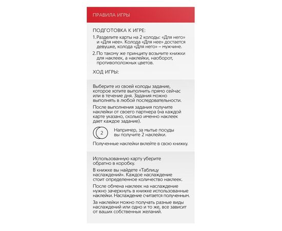С этой игрой ваши домашние дела станут намного горячее и пикантнее. Вы сможете раскрыться с новой стороны и доставить друг другу невероятное удовольствие. Внутри найдёте карты с откровенными заданиями и таблицу наслаждений, которые доведут вас до экстаза.