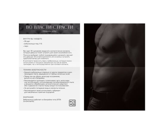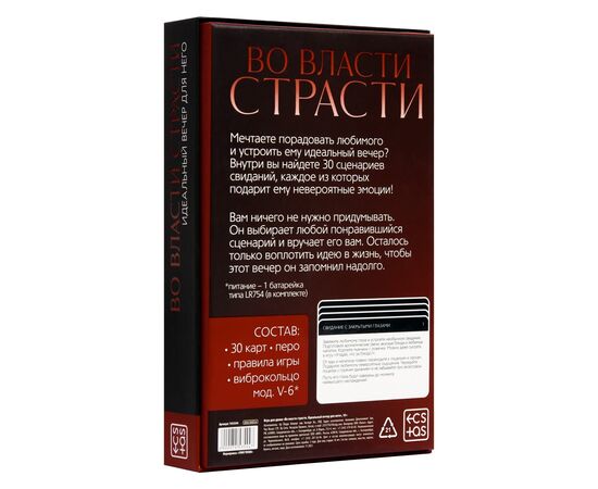 «Во власти страсти» – это серия эротических игр для двоих, главная особенность которой – большое количество ролевых игр и сценариев проведения романтического вечера. Серия включает себя карточные игры, наборы с аксессуарами, наборы кубиков и т.д.