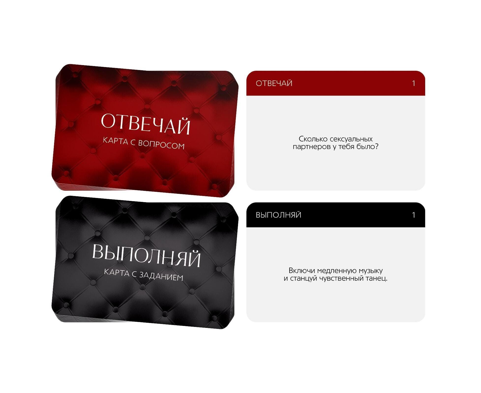 Эта игра поможет вам открыть партнёра с новой стороны и испытать невероятное наслаждение. Разделите карты на 2 колоды «Отвечай» и «Выполняй». По очереди вытягивайте карты из той колоды, на которую укажет ваш партнёр. Вас ждут жаркие вопросы и возбуждающие задания. Подарите друг другу невероятную страсть!