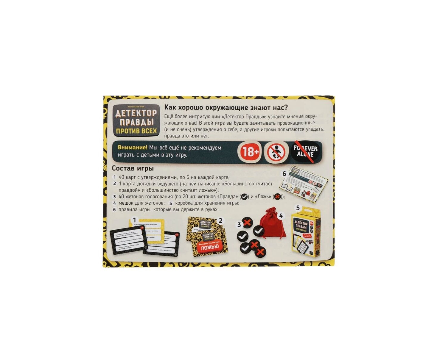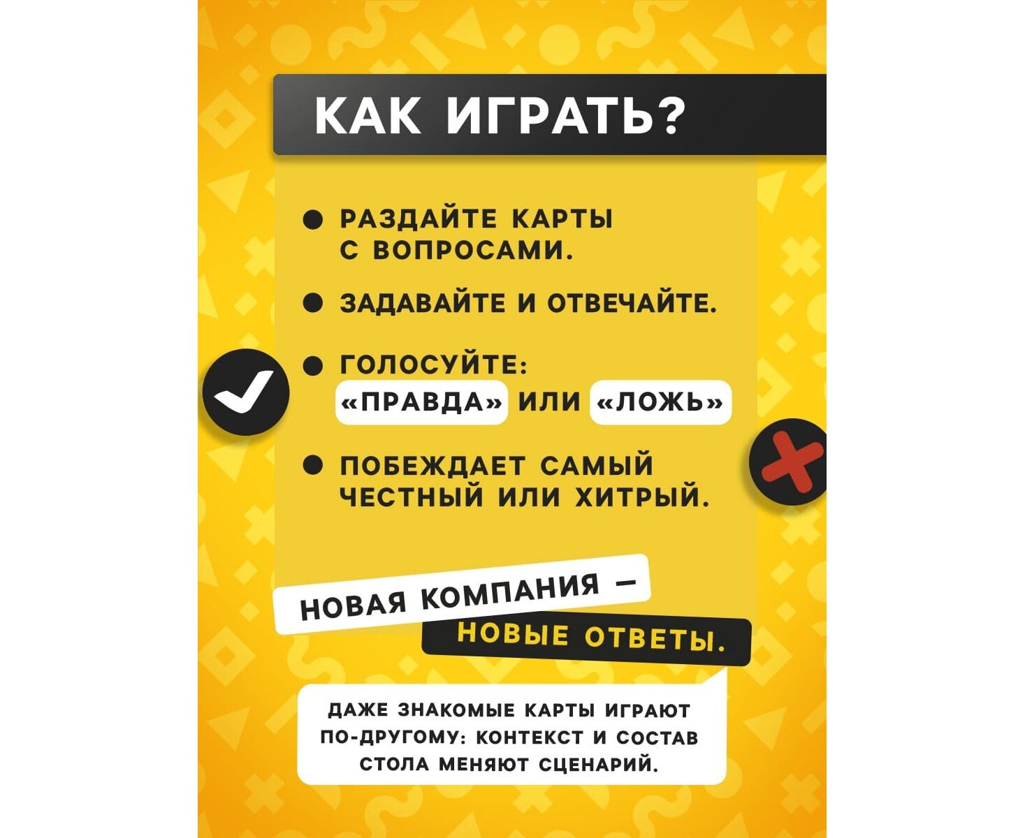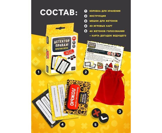 Для чего берут: Чтобы растопить лед, узнать друзей с неожиданной стороны и превратить обычную встречу в атмосферную пати‑игру. Это компромисс между 'правдой' и дружеским блефом: звучит смело, но держится на уважении и чувстве такта. Отличный выбор в коллекцию настольных игр для взрослых и заметный подарок тем, кто любит общение, юмор и карточные развлечения.