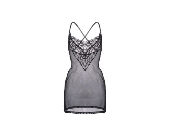 Эластичная сетка облегает тело и выделяет красоту его изгибов. Нежное кружево с цветочным узором украшает зону декольте. Перекрещивающиеся регулируемые бретели расставляют манящие акценты на спине. Крой визуально вытягивает силуэт и придает дополнительную уверенность в сногсшибательности созданного образа.