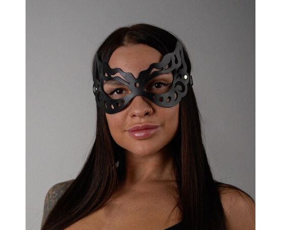 Однослойная открытая маска заострённой формы из натуральной кожи с декоративными резными узорами. Аксессуар плотно прилегает к лицу и хорошо фиксируется на любой обхват головы благодаря упругой широкой резинке. Резные элементы добавляют образу нежности и элегантности.