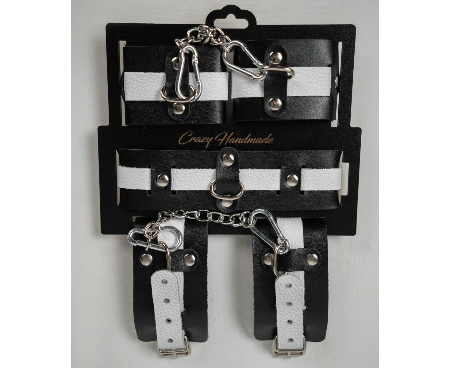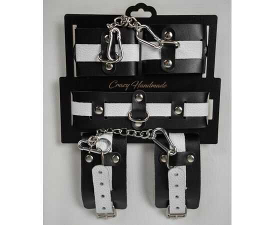 Наручники состоят из двух деталей: основа прямоугольной формы из натуральной кожи черного цвета и ремешок белого цвета с прочной хромированной фурнитурой в виде овального кольца. Расположение ремешка через прорези основной части является декоративным решением, а также служит для лучшей регулировки размера. В комплект входит соединительная цепочка с двумя карабинами.