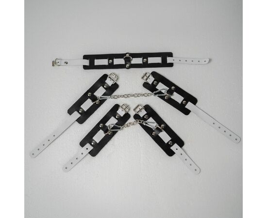Оковы состоят из двух деталей: основа прямоугольной формы из натуральной кожи черного цвета и ремешок белого цвета с прочной хромированной фурнитурой в виде овального кольца. Расположение ремешка через прорези основной части является декоративным решением, а также служит для лучшей регулировки размера. В комплект входит соединительная цепочка с двумя карабинами.