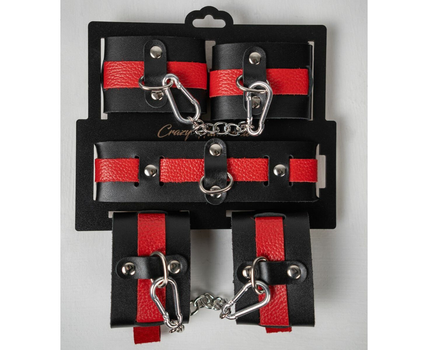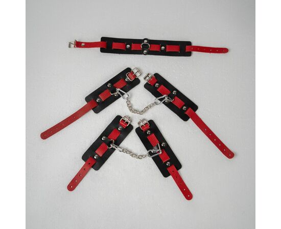 Наручники состоят из двух деталей: основа прямоугольной формы из натуральной кожи черного цвета и ремешок красного цвета с прочной хромированной фурнитурой в виде овального кольца. Расположение ремешка через прорези основной части является декоративным решением, а также служит для лучшей регулировки размера. В комплект входит соединительная цепочка с двумя карабинами.