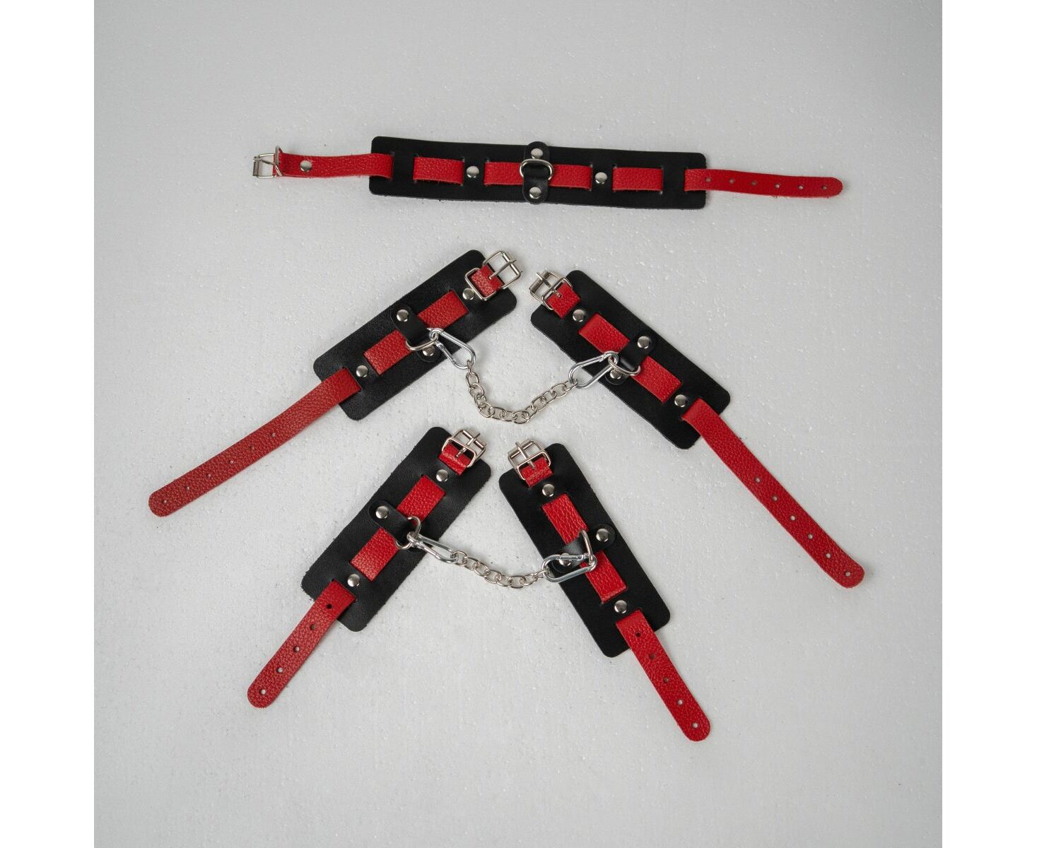 Оковы состоят из двух деталей: основа прямоугольной формы из натуральной кожи черного цвета и ремешок красного цвета с прочной хромированной фурнитурой в виде овального кольца. Расположение ремешка через прорези основной части является декоративным решением, а также служит для лучшей регулировки размера. В комплект входит соединительная цепочка с двумя карабинами.