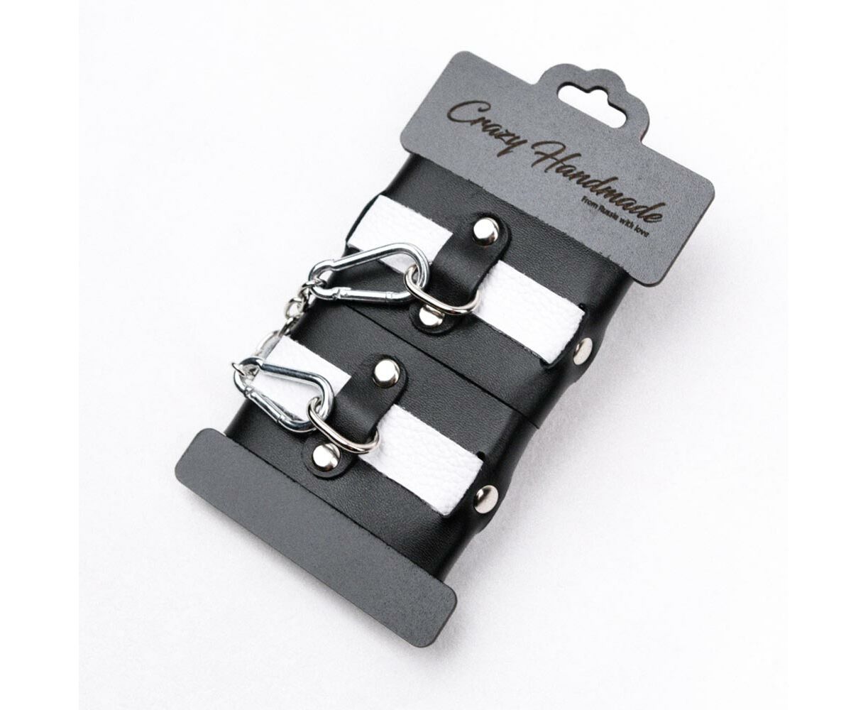 Наручники состоят из двух деталей: основа прямоугольной формы из натуральной кожи черного цвета и ремешок белого цвета с прочной хромированной фурнитурой в виде овального кольца. Расположение ремешка через прорези основной части является декоративным решением, а также служит для лучшей регулировки размера. В комплект входит соединительная цепочка с двумя карабинами.