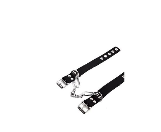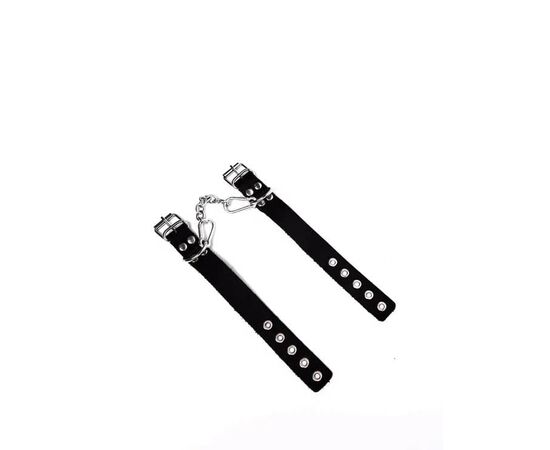 Черные наручники выполнены из натуральной кожи высокого качества. Наручники имеют металлические кольца и карабины. Этот стильный аксессуар для БДСМ-игр обеспечит максимальный комфорт и безопасность при использовании.