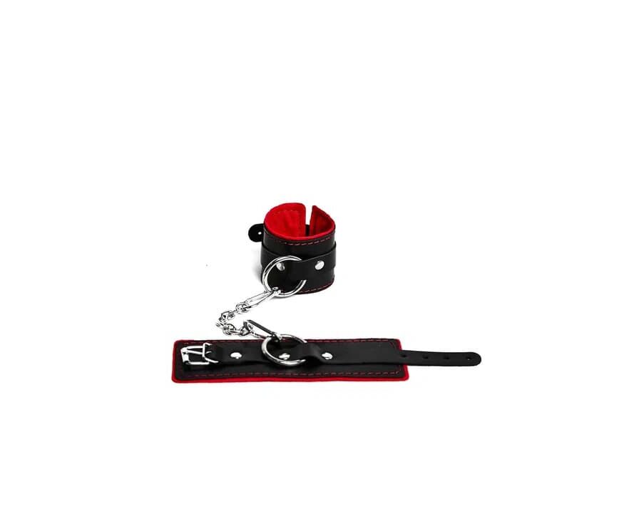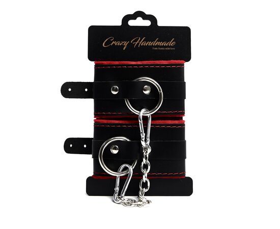 Черные наручники выполнены из натуральной кожи высокого качества, имеют мягкий красный подклад. Наручники имеют металлические кольца и карабины. Этот стильный аксессуар для БДСМ-игр обеспечит максимальный комфорт и безопасность при использовании.