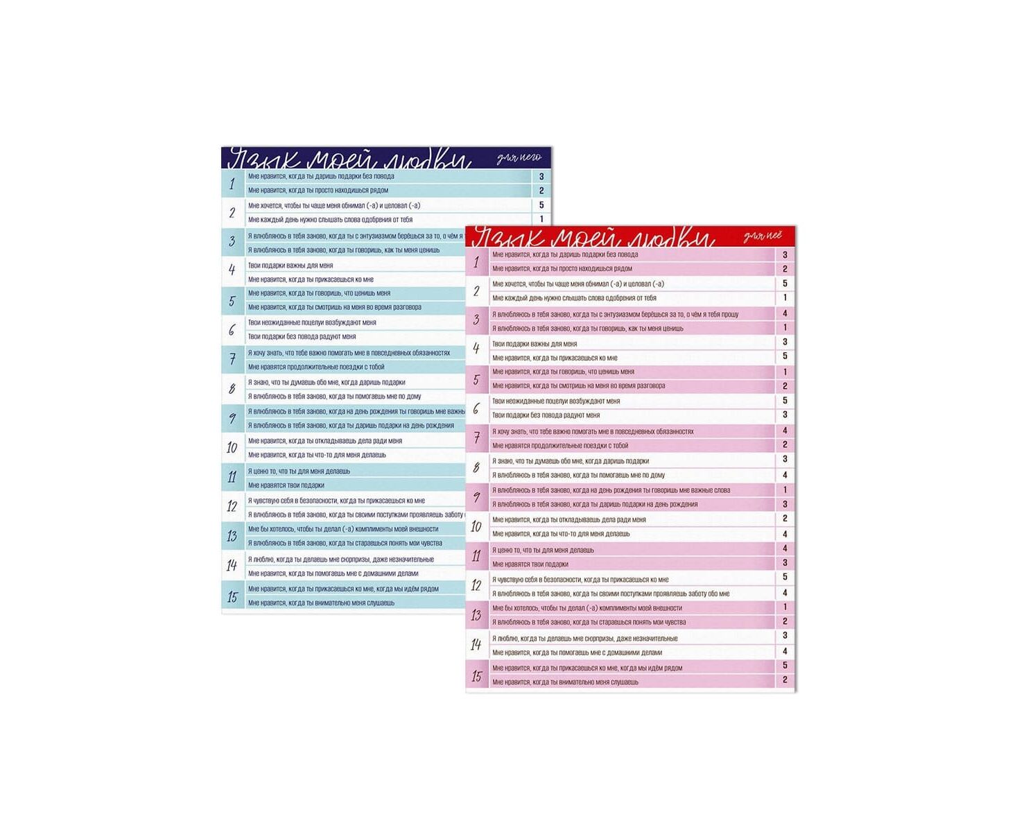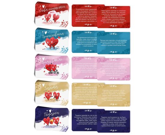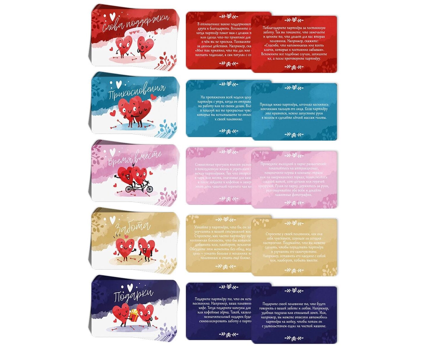 50 карт («Слова поддержки», «Время вместе», «Подарки», «Забота», «Прикосновения»)