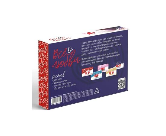 «Всё о любви» – это игра, которая поможет понять, на каком языке любви говорите вы и ваш партнёр. Также вы научитесь проявлять чувства так, чтобы отношения с каждым днём становились всё крепче.