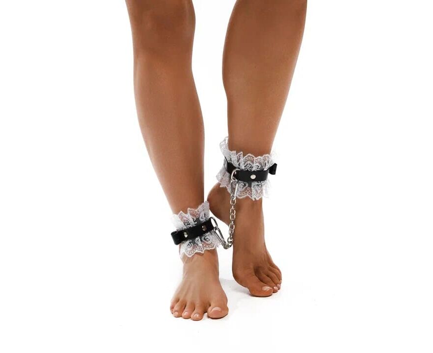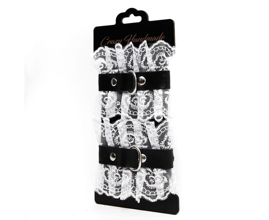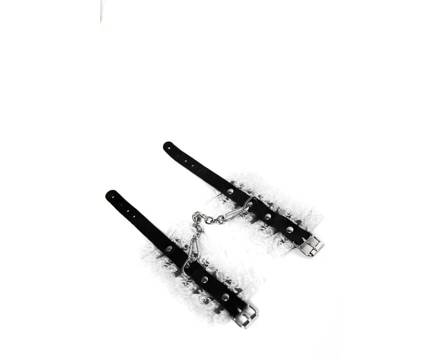 Оковы с белым кружевом, выполненные из натуральной кожи черного цвета. Они надежно фиксируются пряжками и ремнями, позволяющими выбрать нужный размер.Оковы снабжены карабинами, благодаря которым изделия можно соединять между собой. Приятны к телу и прочны в использовании. Станут отличным дополнением к вашей любовной игре!