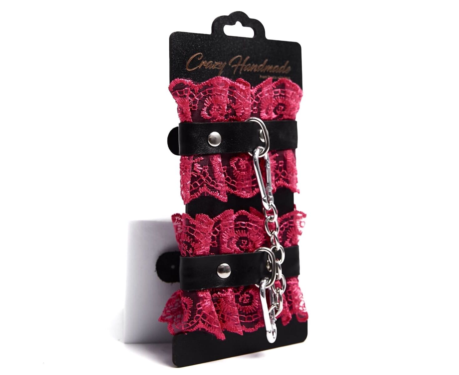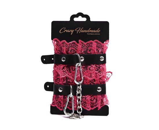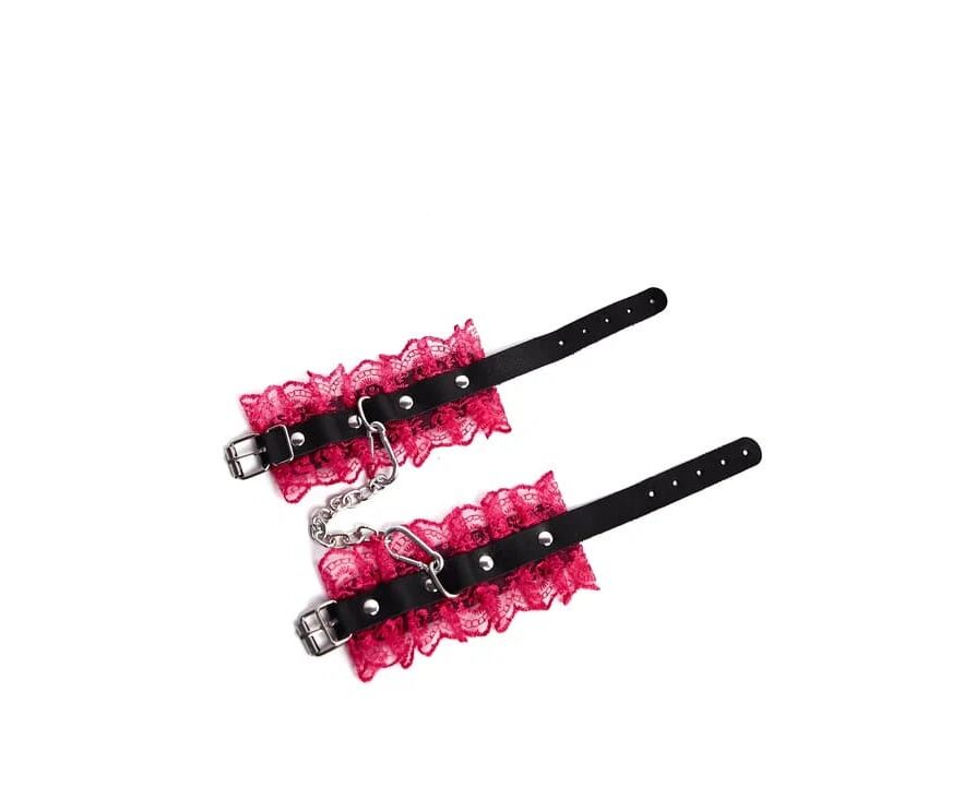 Оковы с кружевом в цвете фуксия, выполненные из натуральной кожи черного цвета. Они надежно фиксируются пряжками и ремнями, позволяющими выбрать нужный размер.Оковы снабжены карабинами, благодаря которым изделия можно соединять между собой. Приятны к телу и прочны в использовании. Станут отличным дополнением к вашей любовной игре!