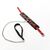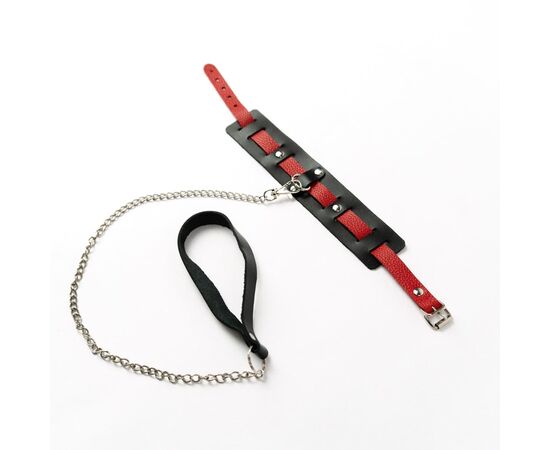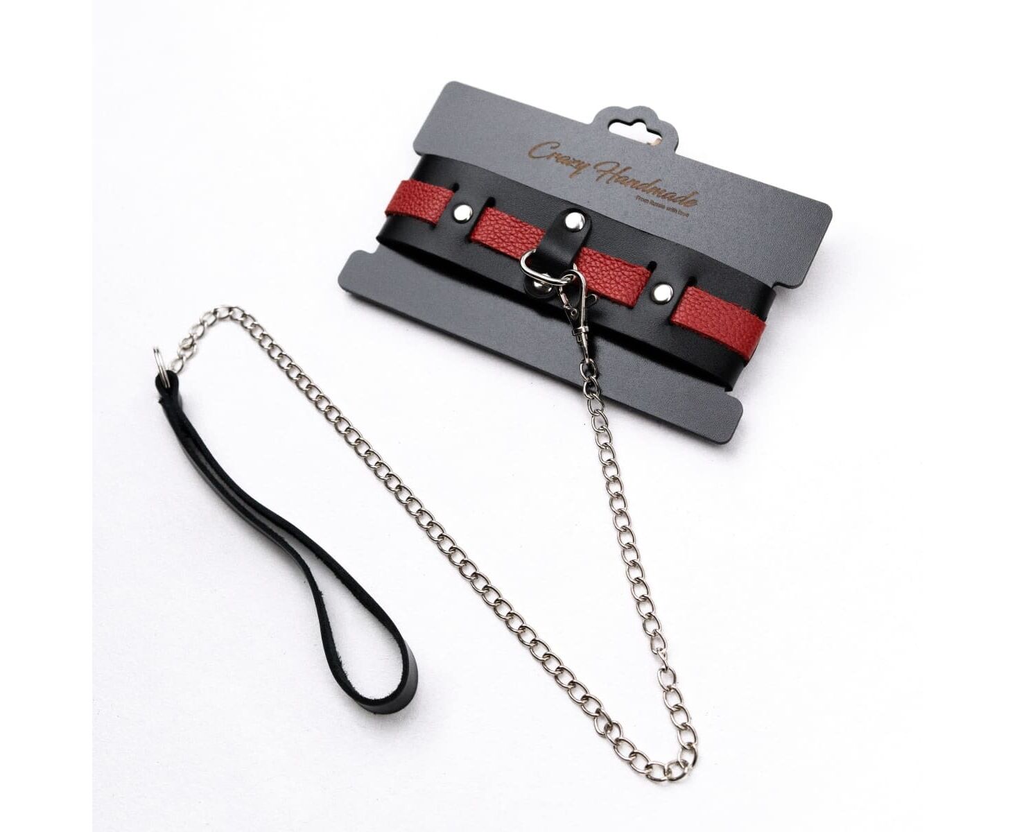 Ошейник состоит из двух элементов: основа прямоугольной формы из натуральной кожи черного цвета и ремешок красного цвета с прочной хромированной фурнитурой в виде овального кольца. Расположение ремешка через прорези основной части является декоративным решением, а также служит для лучшей регулировки размера. В комплект входит поводок с прочной стальной цепочкой, карабином и ручкой-петлей из натуральной кожи.