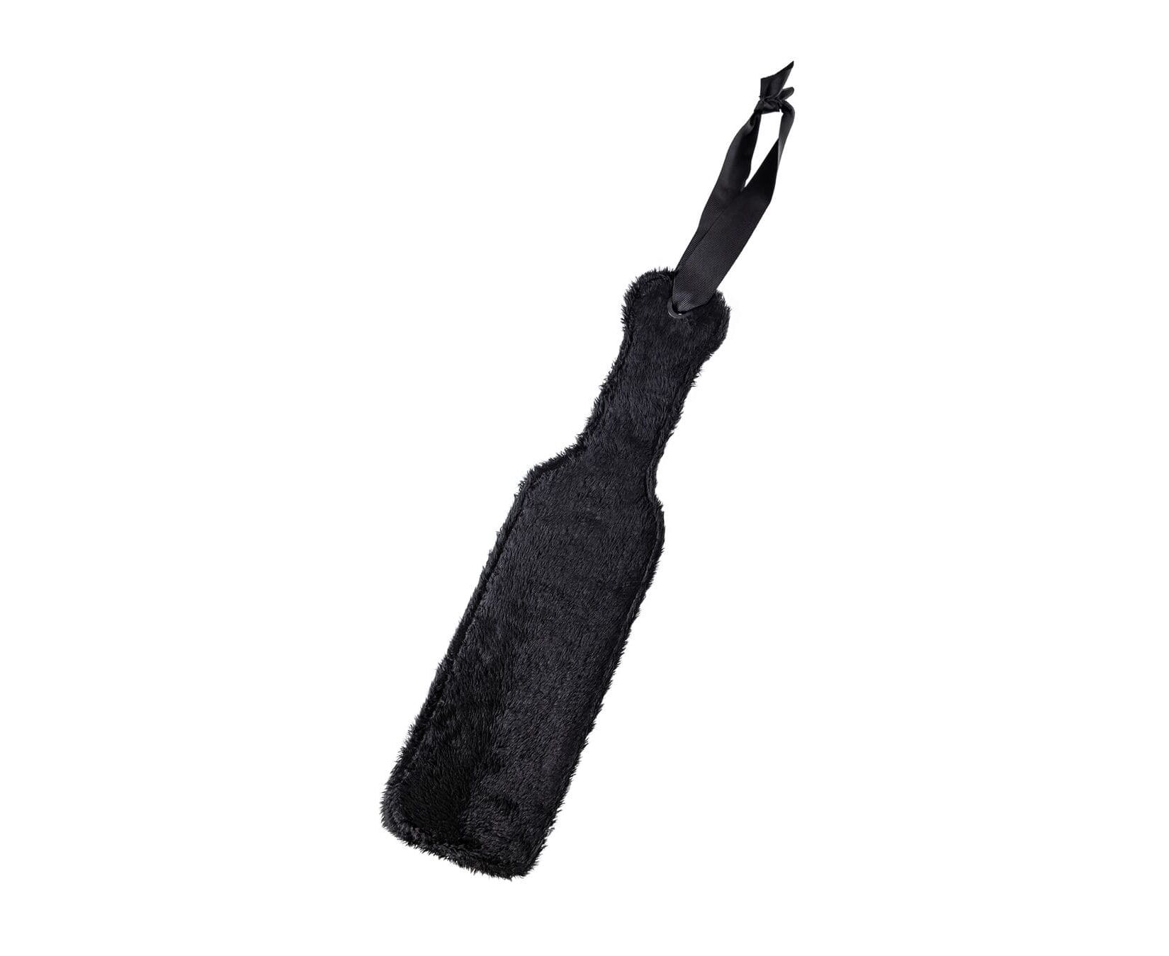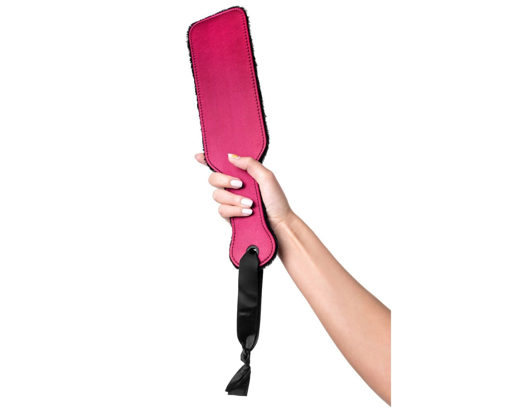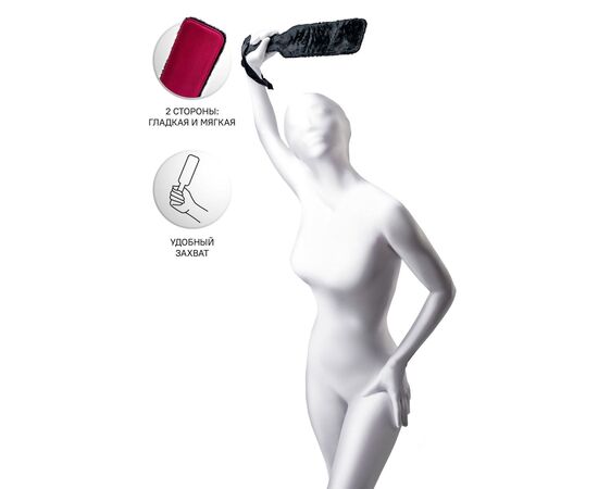 Шлепалка имеет две стороны. Красная сатиновая сторона холоднее на ощупь и жестче по воздействию. Черная сторона более мягкая и подходит для нежного наказания - легкие шлепки или поглаживания.