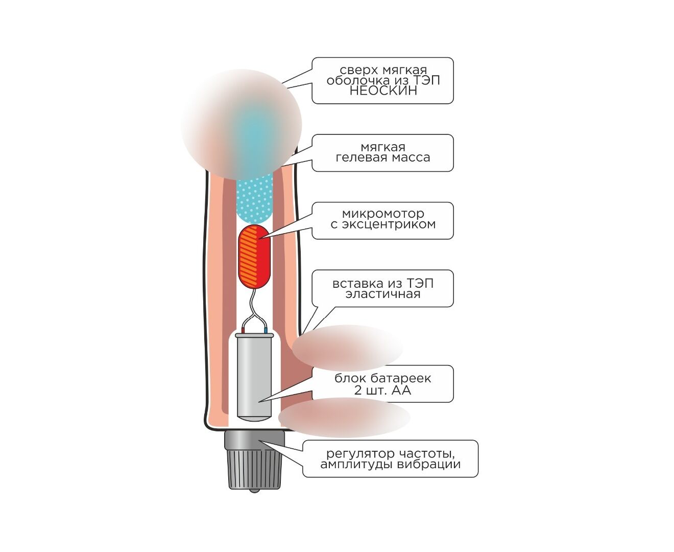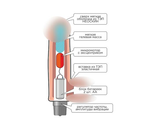 Виброэлемент расположен по всей длине изделия. Степень вибрации регулируется при помощи кнопки, расположенной в основании.