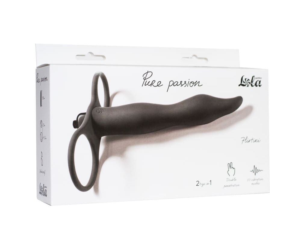 Насадка для двойного проникновения Flirtini из гипоаллергенного силикона. Обладает анатомически верной и гибкой формой. Имеет два кольца, которые крепятся на основание пениса и мошонку. Внутренний диаметр кольца на основание члена– 3см, внутренний диаметр кольца под мошонку – 4,5см. Кольца хорошо тянутся и подходит на любой размер. Дополнительная стимуляция осуществляется благодаря вибропуле с 10 скоростями. Она работает от 1 батарейки типа ААА (не входит в комплект). Легко извлекается из силиконовой насадки и может использоваться отдельно.