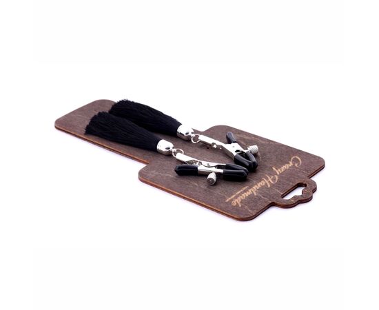 Зажимы мягко сдавливают соски за счет резиновых наконечников, а прикосновения кисточек из шелковых нитей приятно ощущаются на коже. Сила сжатия зажимов регулируется болтиками.
