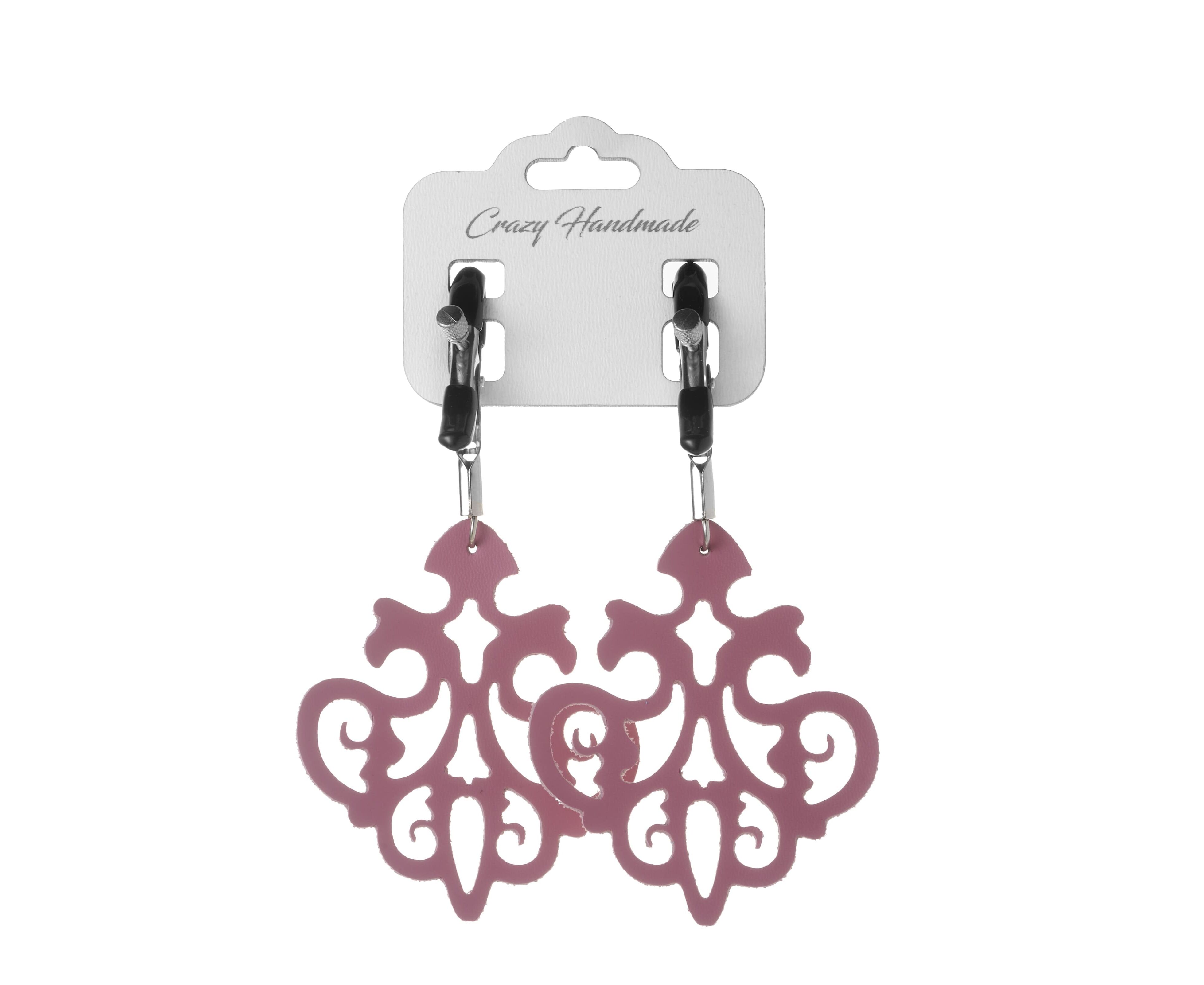 На каждом зажиме закреплен элемент украшения с узорами, который выполнен из высококачественной натуральной кожи розового цвета. Надежная стальная фурнитура с серебристым покрытием добавляет конструкции прочности и элегантности.